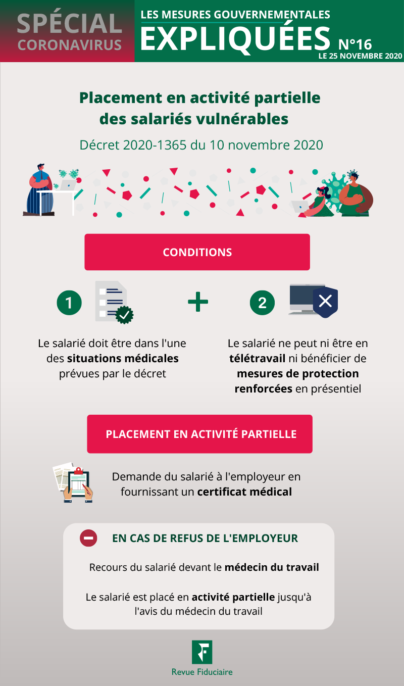 Un décret publié au JO du 11 novembre vient de fixer les nouveaux critères qui permettent aux salariés reconnus comme personnes vulnérables au Covid-19 de bénéficier de l’activité partielle. Pour ce faire, les intéressés doivent être dans l’impossibilité de travailler, que ce soit en télétravail, ou si le télétravail n’est pas possible, en présentiel sous mesures de protection renforcées.
